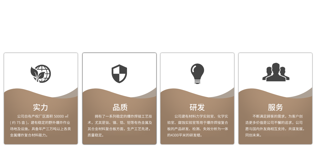 - 安徽弘雷金屬?gòu)?fù)合材料科技有限公司成立于2013年5月,坐落于宣紙之鄉(xiāng)—安徽省宣城市,專業(yè)從事各類金屬爆炸復(fù)合材料研發(fā)、生產(chǎn)、銷售和咨詢。注冊(cè)資本伍仟萬元,自有產(chǎn)權(quán)廠區(qū)6萬余平方米(約90畝),建有自有產(chǎn)權(quán)的野外爆炸作業(yè)場(chǎng)地及設(shè)施,具備年產(chǎn)四萬噸以上能力。...
